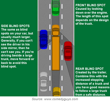 • Do not travel in a truck’s blind spot, especially if you drive a small car. This means you should avoid driving along the right or left of the truck.